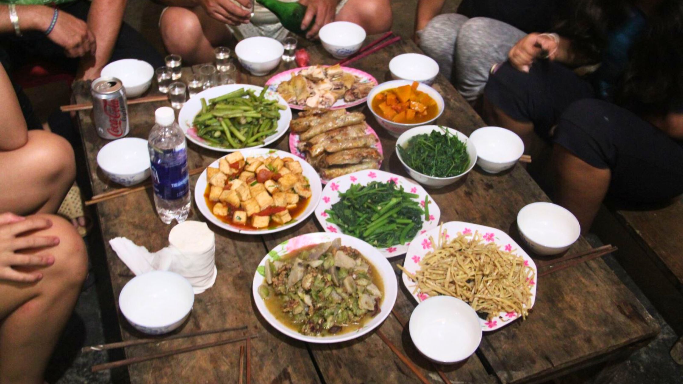 The food is a mix of traditional Dao hill tribe food, Vietnamese food, and some Western comfort options. The Dao food is traditionally smoked pork, or ginger spiced chicken. There are also a range of local vegetables that are often available depending on the season (less options occurring in the winter). Stir fried meat and veggies, spring rolls, tofu and tomatoes are also usually on the menu. As well, some of the best french fries, (yes, french fries!) you may ever have are often freshly cut and fried with garlic. The set menu changes frequently with the season just so you are aware. Pancakes, noodle soup, fruit, and / or eggs are the usual options for breakfast. Rice wine is also traditionally served at ever meal, but beer, water, coffee, tea, and soda can be purchased at the homestay or local store (water, tea and coffee are provided on Footprint tours!).